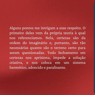 Alguns pontos me intrigam a esse respeito. O primeiro deles vem da própria teoria à qual nos referenciamos. Nela, certezas são da ordem do imaginário e, portanto, são tão necessárias quanto são o terreno certo para serem questionadas. Todo fechamento em certezas nos aprisiona, impede a solução criativa, e nos coloca em um sistema hermético, adoecido e paralisante.