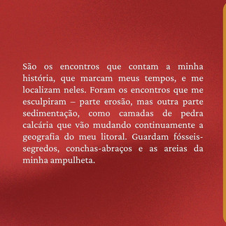 Passeando por esses encontros revisito grandes lições, algumas em gestos aparentemente pequenos; outras em palavras que podiam ser amorosas, mas também podiam ser duras. Tenho uma lista rica de nomes que me construíram. São os encontros que contam a minha história, que marcam meus tempos, e me localizam neles. Foram os encontros que me esculpiram – parte erosão, mas outra parte sedimentação, como camadas de pedra calcária que vão mudando continuamente a geografia do meu litoral. Guardam fósseis-segredos, conchas-abraços e as areias da minha ampulheta.