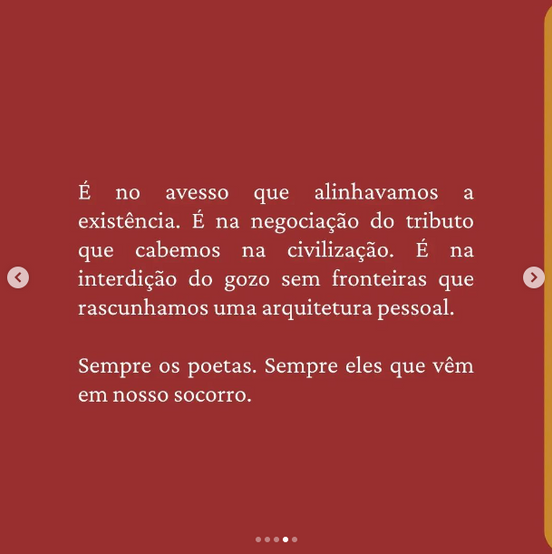 É no avesso que alinhavamos a existência. É na negociação do tributo que cabemos na civilização. É na interdição do gozo sem fronteiras que rascunhamos uma arquitetura pessoal.